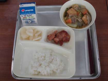 3月11日(木)、今日の給食のメニューは、「ごはん、鶏肉のチリソース焼き、中華煮、大根の中華あえ、牛乳」でした。