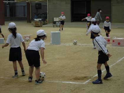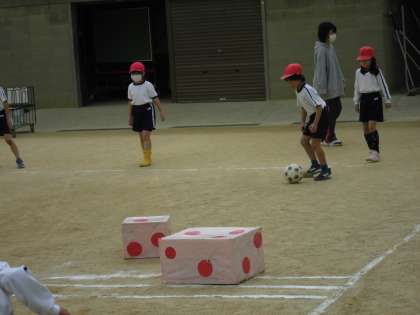 3月12日(金)、1年生は体育科の時間にボールゲームをしました。箱でできた的をめがけてボールを蹴ります。相手の陣地に的を押しやれば得点です。