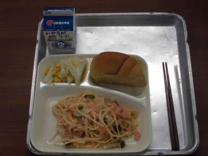 3月16日(火)の給食のメニューは、「黒糖パン(小)、さけのクリームスパゲッティ、カリフラワーとコーンのサラダ、牛乳」でした。