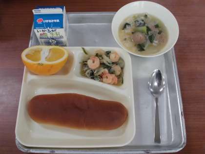 3月18日(木)、今日の給食のメニューは、「黒糖パン、えびと野菜のいためもの、中華がゆ、はっさく、牛乳」でした。