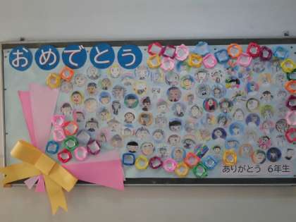 卒業式を目前に控え、廊下・階段掲示も卒業のお祝いムード満載です。