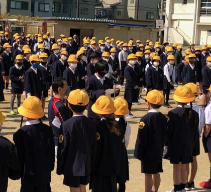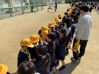 今朝、校庭にて1年生の歓迎式が行われました。6年生から歓迎の言葉があり、3年生から1年生に手作りのメダルが贈られました。学校生活がはじまって、緊張で「ドキドキ」、不安で「ソワソワ」だった新入生も、やさしい上級生の笑顔とおもてなしで、「ワクワク」「ウキウキ」と楽しい気持ちになったと思います。今津小学校をひとつの大きな家族のようにみんなにとって居心地のよい学校にしていきましょう。