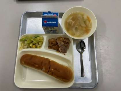 今日のメニューは、豚肉のデミグラスソース、キャベツとコーンのソテー、スープ、おさつパン、牛乳でした。