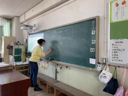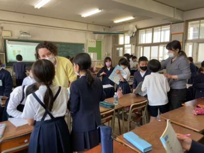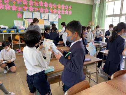 「My name is 〜」「I like 〜」という表現でクラスの友だちと会話をしました。楽しみながら英語を学ぶことができました。