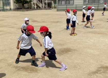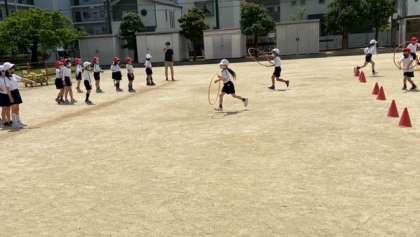 「じゃんけんぽーん」 足じゃんけんで友だちと一緒に楽しみながら体を動かしました。フープを使ったリレーは、思い通りにフープが転がってくれずに苦労しましたが、周りのみんなの励ましの声に支えられてがんばりました。