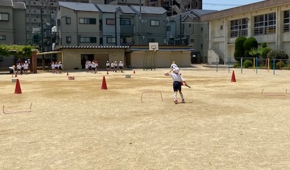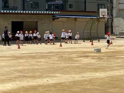 安全に配慮しながら、簡単な障害物を乗り越えるリレー形式のかけっこを行いました。子どもたちは身体を動かすことができうれしそうでした。