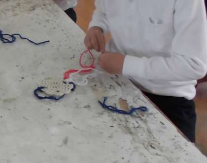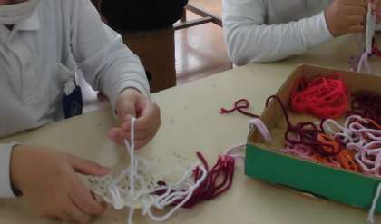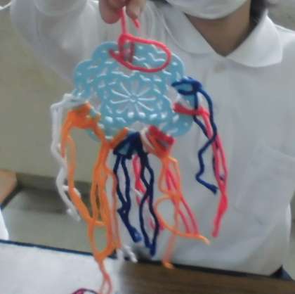 今年度初めてのなかよしタイムでした。コースターにひもを結び、ドリームキャッチャーをつくりました。ドリームキャッチャーをつるしていると、悪い夢をつかまえて、いい夢だけ見られるようになるといわれています。おもいおもいに、ひもをコースターに結んでいました。
