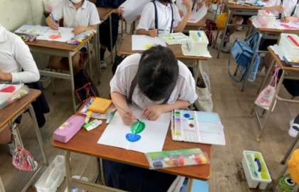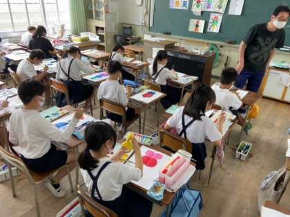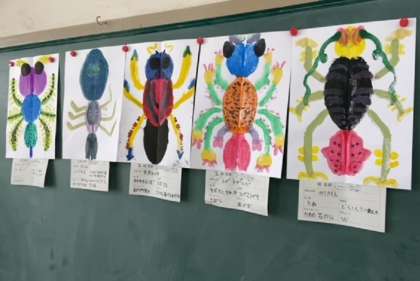 画用紙に折り目をつけ、片方に絵の具をたっぷり塗って、ペタンッ。半分にはさんで、そして開いて。片方の絵の具がもう片方にもついて、虫の頭、胸、腹、足、しょっかくが上手に描けました。できあがった虫はまさに新種。友だちと見せ合いっこして、みんなうれしそうでした。