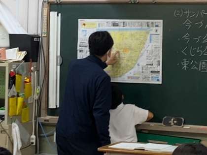 「あなたがすんでいるまちは『どんなまち』ですか?」−先生からの問いかけに、今津地域の特ちょうや目印になる建物、場所を地図も使いながら答えてくれました。