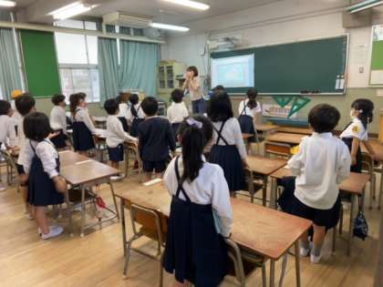 1年生の教室でも朝からみんなで英語のモジュール活動がおこなわれました。「グッドモーニング!」と明るい声がひびいていました。