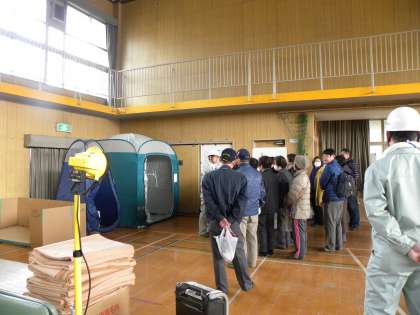 講堂では、プライベート用のテント(赤ちゃんへの授乳などに使用)や段ボールで作った簡易ベッドが展示され説明していただきました。