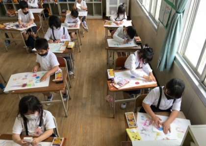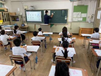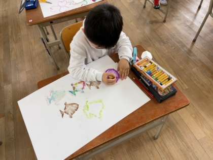 型をくり抜きそこにクレパスで色をのせ、指でのばして絵を描きました。色を重ねたり、画用紙をいくつも切って型を何種類もつくたり、みんな個性的な作品を楽しくつくりあげました。