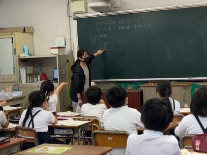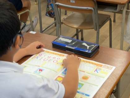 「a・i・u・e・o」。先生に続いて、空中に文字を書きます。ローマ字がわかると街中に出かけたとき、英字で書かれたかんばんも読めるようになりますね。