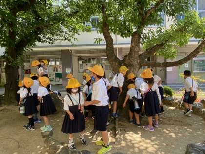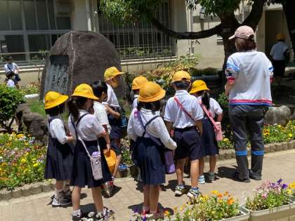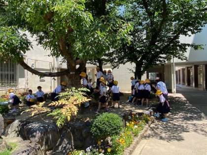 春と夏の花、草、虫を観察しようと学校内を先生といっしょに歩きました。校門付近の大きな木をさわったり、幹にできた穴の中をのぞいたり。天気がよくて気持ちよかったね。