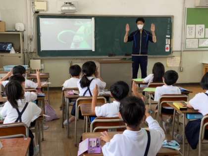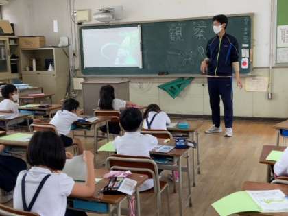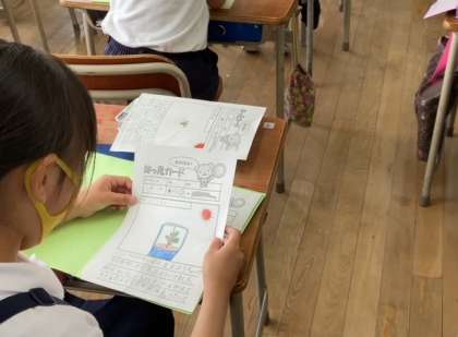 いま2年生ではいろいろな植物や食べ物などを観察して、その姿を「はっ見カード」に描きうつすことをしています。「イメージではなくて実際に見えたものを描きましょう」という先生からの話をしっかりときくことができていました。