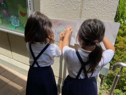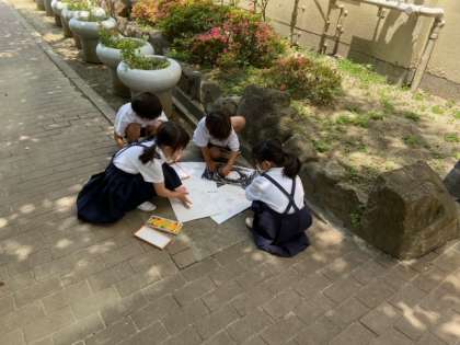 1年生の図工の学習は、「クレヨンとパスとなかよし」でした。教室の外に出て、模様ができそうな壁や床などの場所を探し、紙にクレヨンで「こすりだし」をしました。こすりだすと模様や形が色々とできて、それらを組み合わせることでおもしろい絵ができあがります。みんな歓声をあげながら制作を楽しんでいました。