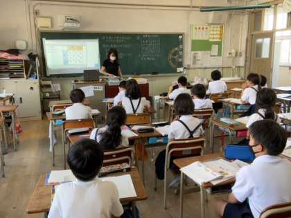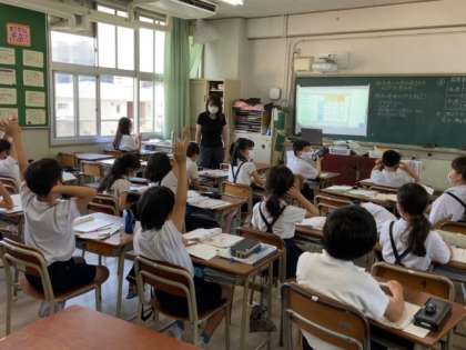 二つの質問の回答について、その組み合わせを考えたときに、どのように表に整理するとわかりやすくなるかを学びました。みんな積極的に手をあげてくれています。