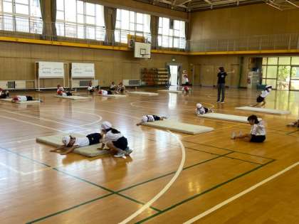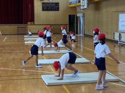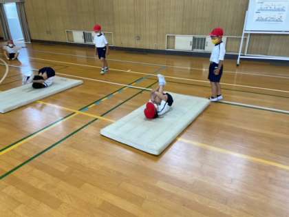 マットを使ってからだを動かしました。ゴロゴロと転がったり、手をついて足を高くけりあげたり、マット運動になれることから始めています。近いうちに前回りにチャレンジする予定です。