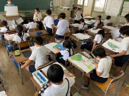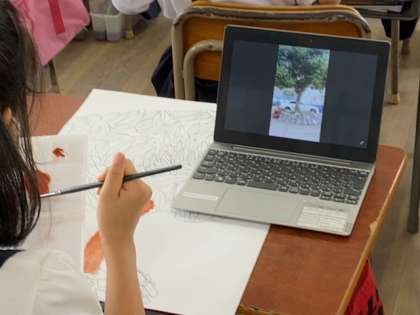 校内で見つけた樹木をノートPCで撮影し、その写真を見ながら絵を描いているところです。子どもたちの目線から描かれた木々はとても新鮮に感じます。