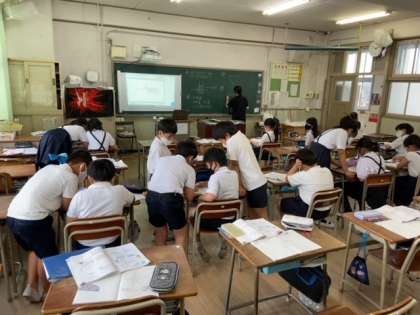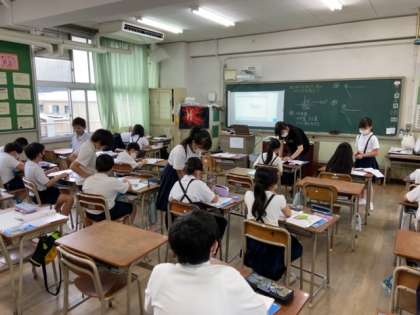 180度より大きい角のはかり方について、みんなで相談しながら考えました。円の一周の角度が360度であることから、求める角でないほうの角度を分度器ではかり、360度から引き算することを学びました。