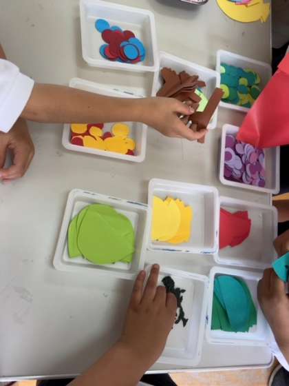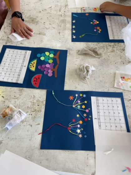 みんなで7月のカレンダーをつくりました。あらかじめ先生が用意してくれた、色々なかたちの色紙をペタペタとできあがりをイメージしてはり付けていきました。スイカや花火など夏らしいデザインのカレンダーをつくることができました。