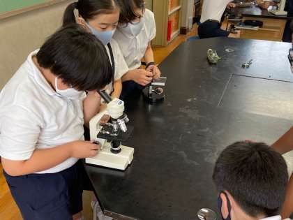 「自然の池や川などでも食物連鎖が見られるのだろうか」という課題のもと、田んぼからすくってきた水の中にいる生物を顕微鏡で観察しました。カブトエビのような水中生物のほかに、両生類のものと思われる卵などを見てグループごとで感想を伝え合いました。