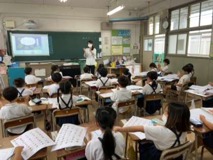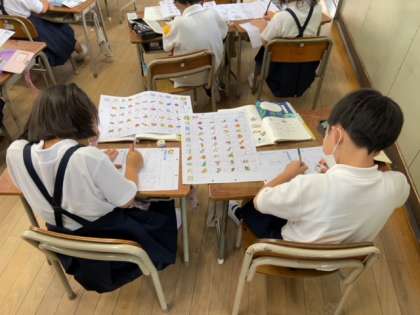 「きっぷ」「いしゃ」「きゅうり」といった小さい文字が入る言葉を学びました。先生といっしょに手びょうしを打ち、小さい音のひびきも確認しました。