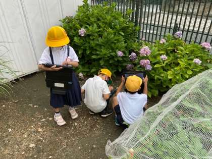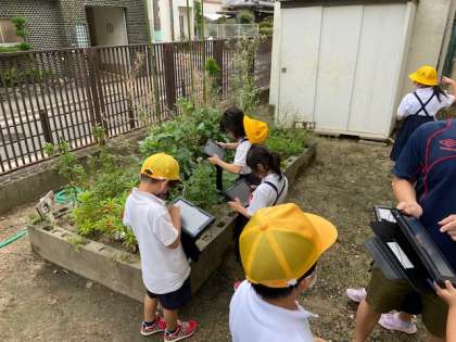 タブレットを使った学習として、夏の草花や栽培している野菜の写真を撮影しようと校内を歩きました。ホウセンカ、アジサイ、トマト、スイカ・・・。1年生もタブレットを使うことがとても楽しみになってきたようです。