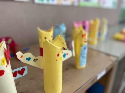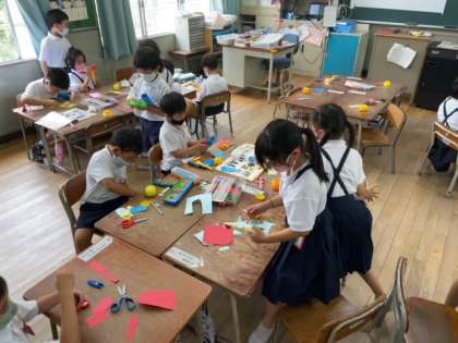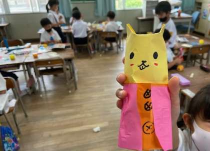紙をまるめて、のりづけし、そこに顔やかざりなどを書き込みました。個性あふれるユニークな作品がいくつもできあがり、友だちどうしで見せ合いっこをして楽しい時間を過ごしました。