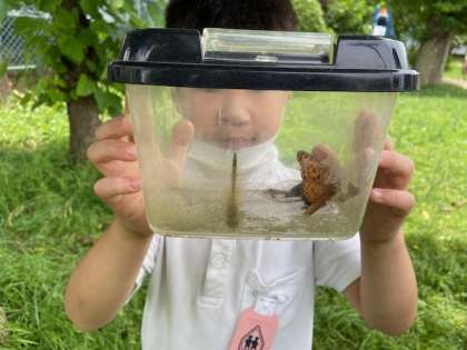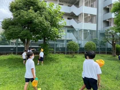 2時間めが終わっての少し長めの休けい時間、子どもたちは木々がしげるアスレチックエリアで、虫とりに夢中です。帽子をつかって、エイッと腕をふるとトンボや蝶、セミなどをつかまえることができました。