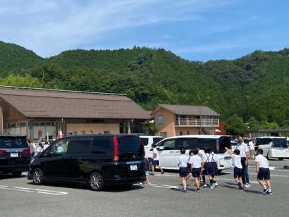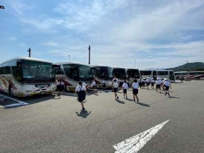2カ所めの休憩所です。大阪市の他の小学校のバスもたくさん停まっていました。あと、40分から50分で到着予定です。