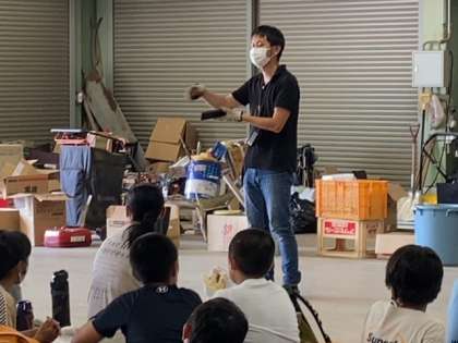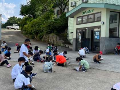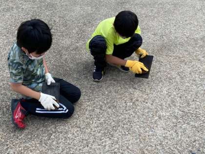 あらかじめ施設の方に焼いてもらっていた板をたわしを使って懸命に磨いています。腕が少し黒くなることも気にせず集中して取り組んでいます。磨いた板に明日、図柄や絵を描き込む予定です。