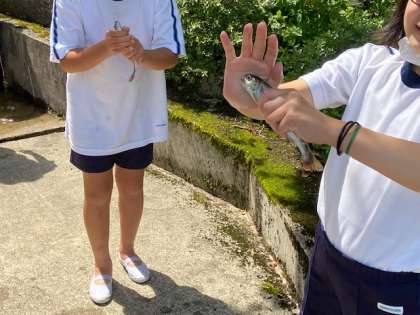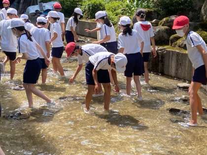 魚つかみにチャレンジです。魚は放流されたヤマメです。すばやく動く魚にみんな悪戦苦闘。でもがんばってつかまえたときには歓声があがっていました。
