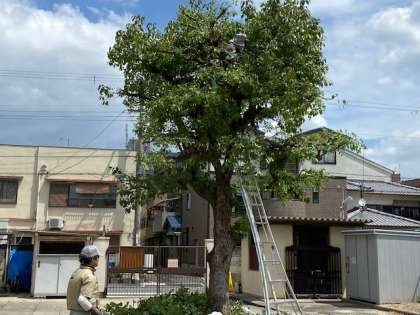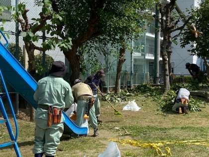 今日、炎天下にあって、管理作業員さんのグループ(校園営繕園芸事務所)の約10名の方々が、校内の木々の手入れをしてくださいました。アスレチック付近もすっきりときれいに整えられ、緑が映えています。皆さん暑いなか、ありがとうございました。