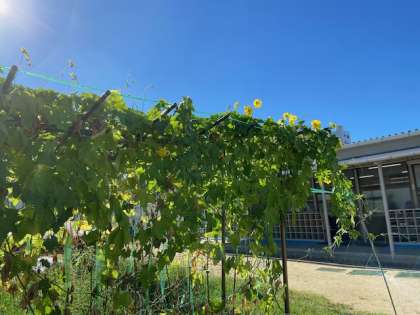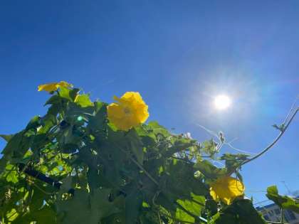 8月に入って暑い日が続いています。学習園に咲くヘチマの花も「暑いよぉ」と訴えかけているようです。二学期が始まる今月下旬には少しはしのぎやすくなるのでしょうか。