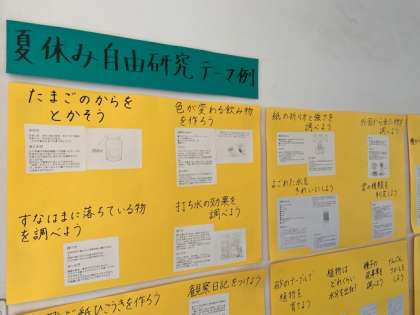 夏休みも半分以上が過ぎました。夏休み中に自由研究に取り組もうと考えていた皆さん、進み具合はどうでしょうか。先生たちが休み前にろう下に貼ってくれていた「夏休み自由研究 テーマ例」をホームページにも載せておきますね。まだテーマ選びで迷っている人は参考にしてください。