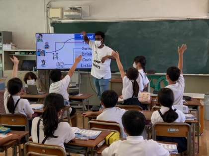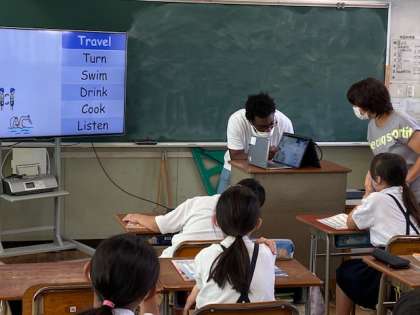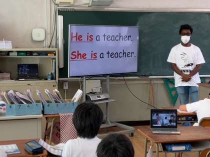 久しぶりの外国語活動です。みんな積極的に発話をしてくれます。オンラインでつないだ子どもたちも教材の画面を見ながら一緒に学びました。