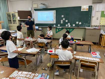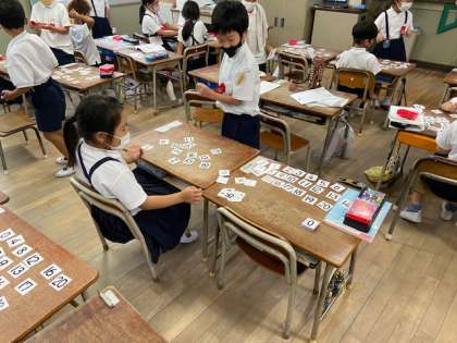 二人ペアになって、先生が出題する「数についての問題」の答えの数字のカードを探して取り合いました。楽しく数の計算を学ぶことができました。
