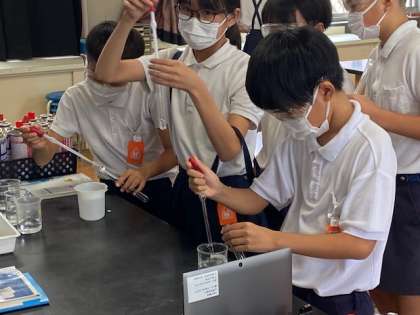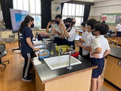 「炭酸水」「食塩水」「うすい塩酸」「重そう水」「うすいアンモニア水」の5種類の水溶液はどのように区別できるか、実験を行いました。見ため、におい、蒸発させた結果、という3点からちがいをたしかめていきました。