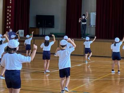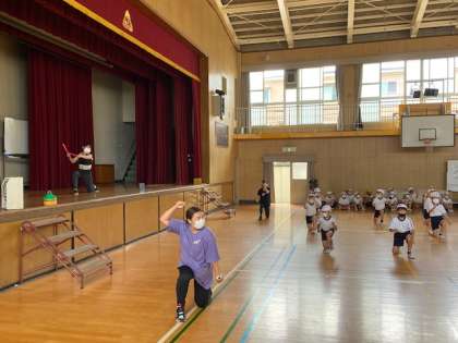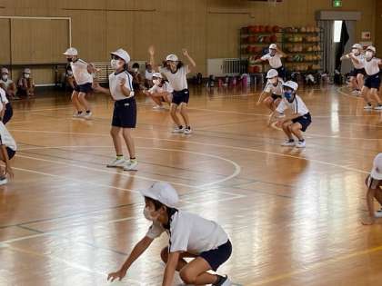 運動発表会で披露する民謡に合わせての踊りの練習です。勇壮な曲調の民謡ですので、子どもたちの動きがとてもかっこうよく感じます。先生の指導も熱がはいります。