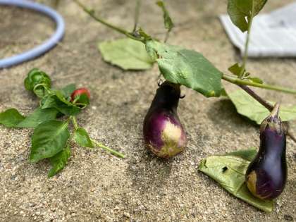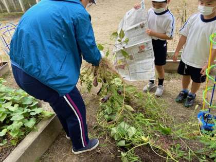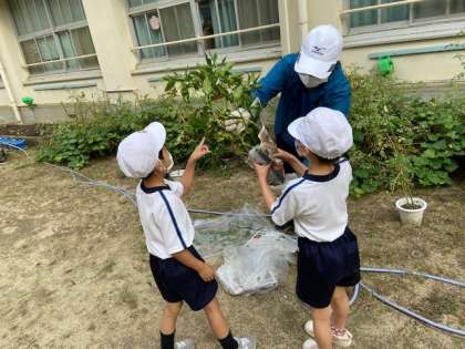学習園で育てたピーマン、なすび、ミニトマトなどを枝や茎ごと収穫し、教室にもっていって観察をしました。今までピーマンが苦手だったという児童も、自分たちが育てたやさいを興味ぶかく観察してくれたようです。