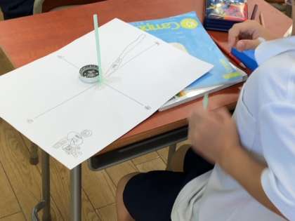 画用紙にストローを立てて、簡単な日時計をつくりました。時間によって、影がどのようになっていくかを、方位磁石も使って調べていくことにしています。