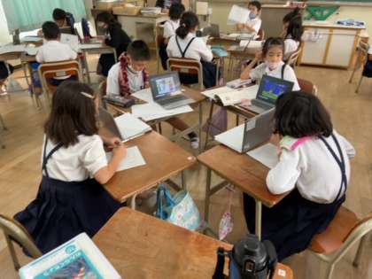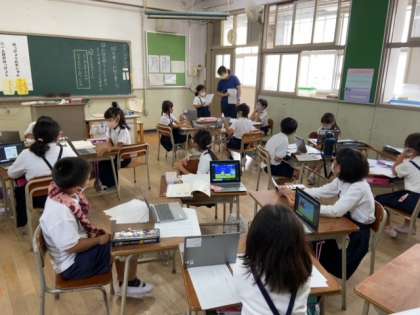 2年生では3学級それぞれで、4コマまんがの3コマめを絵に書き、お話をつくるという学習を進めています。今日は、3コマめについてPCを使って絵を描き、グループを組んで、そのお話を友だちに伝えました。また、その発表内容について、よかった点と理由を友だちのために書いてあげました。