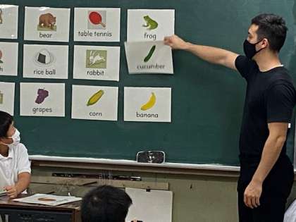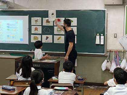 12枚のパネルの後ろ1枚分だけ、みんなにはわからないようにマークを書き、その絵を英語で読み上げてパネルを開けて、そのマークがどこにあるかを当てるというゲームを行いました。みんな積極的に答えてくれて、とても盛り上がりました。