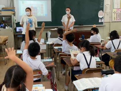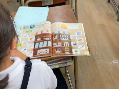 身の回りにあるペンや消しゴムなどの文房具に関して色や数などをまじえて、英語で表現をすることを学びました。みんな積極的に英語で話そうとしてくれています。