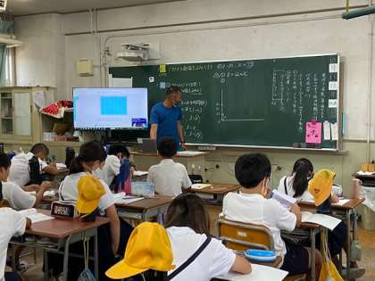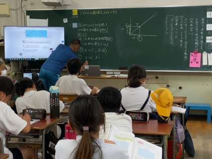 グラフの成り立ちを理解して縦軸、横軸の数値を読み取る学習を行いました。一定時間あたりの水の量が一定であることを前提に、水を入れる時間と水の深さの関係をグラフにして、今から5分後に水の量はどうなるかといった考察をしました。