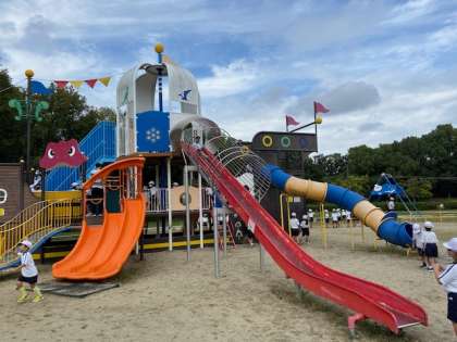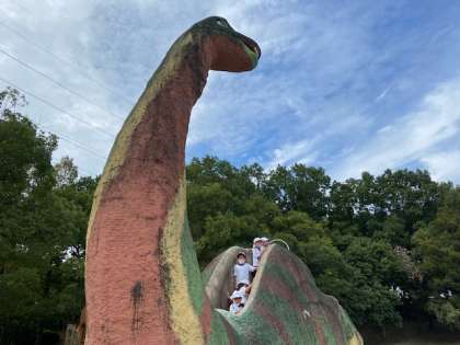 次に「恐竜広場」へ移動しました。大きな恐竜の遊具がシンボリックに設置されています。ここにはターザンロープもあり子どもたちが列をつくっていました。
