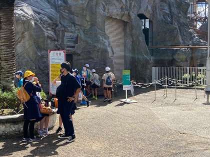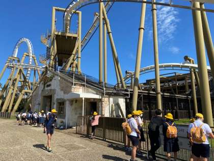 名物アトラクションのピレネーに早速乗ったよ、という児童。次はどこにしよう、と迷っている児童。急流すべりで絶叫する児童。みんな楽しそうです。