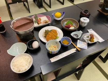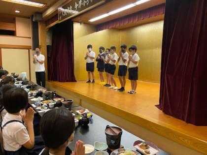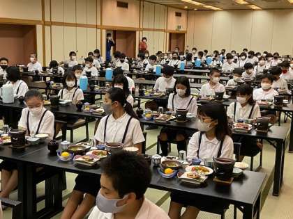 お待ちかねの夕食です。感染症予防に配慮しての配膳です。係の児童の食事の挨拶があり、みんなで箸を進めました。