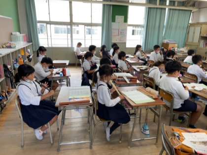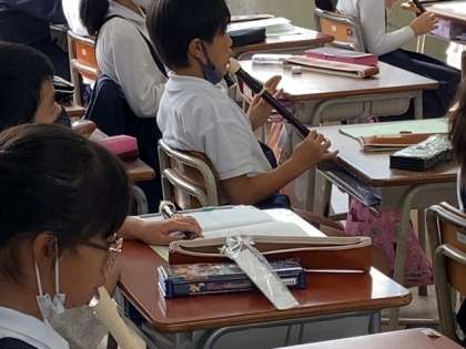 久しぶりのリコーダー演奏でした。ふたつのチームに分かれて順に吹きました。学習のめあてである「休符」を意識しながらリズミカルに演奏ができていました。